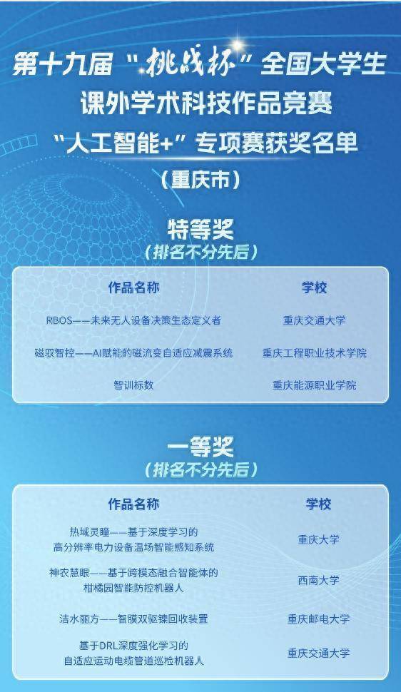 11月4日,上游新闻(报料邮箱:baoliaosy@163.com)联系了重庆交通大学。据该校团委负责人介绍,“‘挑战杯’竞赛被誉为当代大学生科技创新的‘奥林匹克’盛会,其中今年举办的‘挑战杯’全国大学生课外学术科技作品竞赛,俗称‘大挑’。本届竞赛设置主体赛及‘人工智能+’‘揭榜挂帅’专项赛,共吸引来自2700多所高校的40余万件作品、300多万名大学生参赛。经过激烈角逐,共有640件和643件作品分别入围主体赛和‘人工智能+’专项赛终审决赛。”